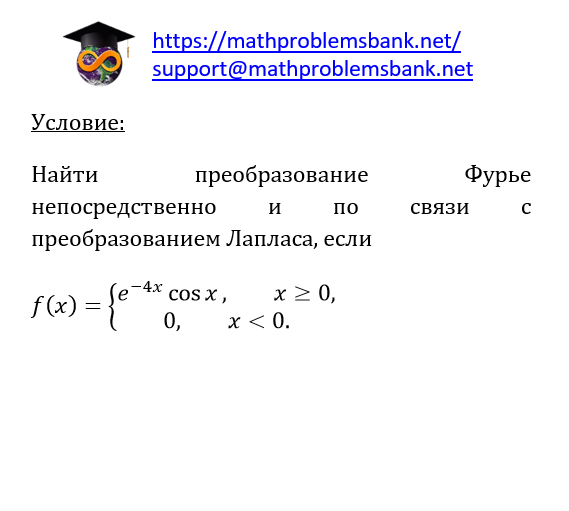 Условие: Найти преобразование Фурье непосредственно и по связи с преобразованием Лапласа, если \[ f(x)=\left\{\begin{array}{c} e^{-4 x} \cos x, \quad x \geq 0 \\ 0, \quad x<0 \end{array}\right. \]