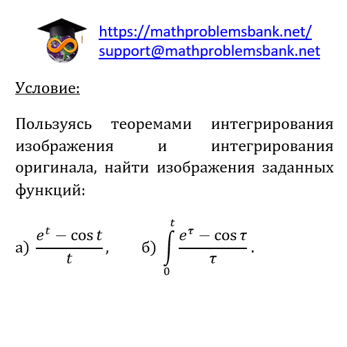 Условие: Пользуясь теоремами интегрирования изображения и интегрирования оригинала, найти изображения заданных функций: a) \( \frac{e^{t}-\cos t}{t} \), б) \( \int_{0}^{t} \frac{e^{\tau}-\cos \tau}{\tau} \).