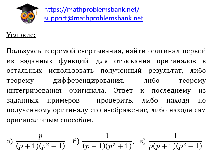Условие: Пользуясь теоремой свертывания, найти оригинал первой из заданных функций, для отыскания оригиналов в остальных использовать полученный результат, либо теорему дифференцирования, либо теорему интегрирования оригинала. Ответ к последнему из заданных примеров проверить, либо находя по полученному оригиналу его изображение, либо находя сам оригинал иным способом. a) \( \frac{p}{(p+1)\left(p^{2}+1\right)} \) б) \( \frac{1}{(p+1)\left(p^{2}+1\right)} \) в) \( \frac{1}{p(p+1)\left(p^{2}+1\right)} \).