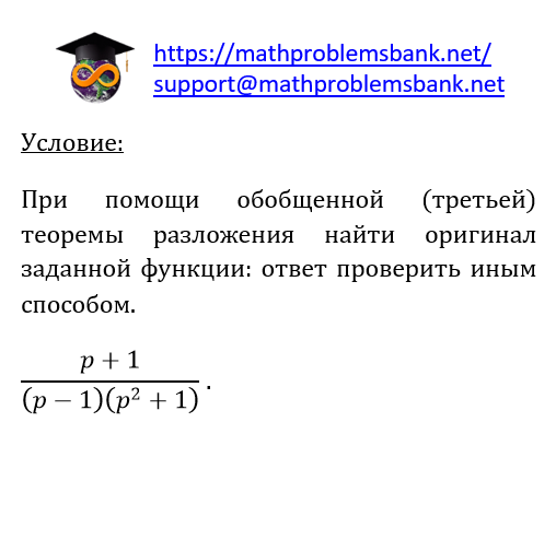 условие: При помощи обобщенной (третьей) теоремы разложения найти оригинал заданной функции: ответ проверить иным способом. \[ \frac{p+1}{(p-1)\left(p^{2}+1\right)} \]