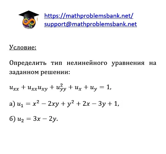 условие: Определить тип нелинейного уравнения на заданном решении: \[ u_{x x}+u_{x x} u_{x y}+u_{y y}^{2}+u_{x}+u_{y}=1 \] a) \( u_{1}=x^{2}-2 x y+y^{2}+2 x-3 y+1 \), б) \( u_{2}=3 x-2 y \)