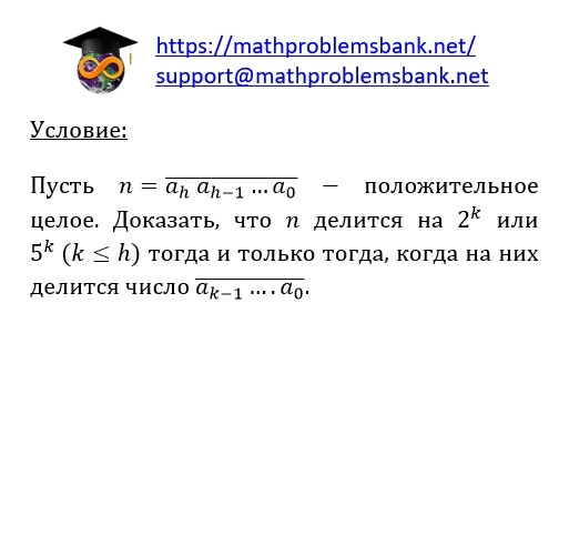 Условие: Пусть \( n=\overline{a_{h} a_{h-1} \ldots a_{0}} \) - положительное целое. Доказать, что \( n \) делится на \( 2^{k} \) или \( 5^{k}(k \leq h) \) тогда и только тогда, когда на них делится число \( \overline{a_{k-1} \ldots a_{0}} \).