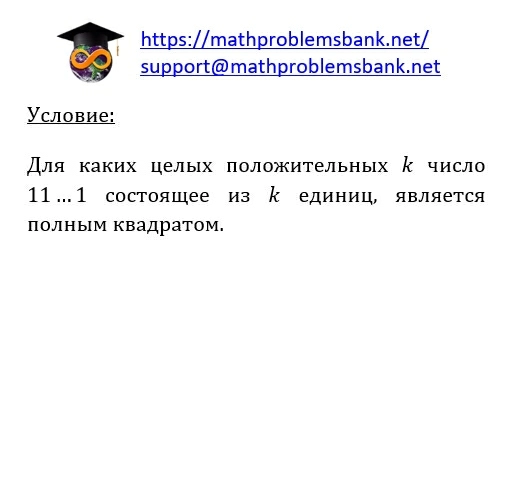 \( \underline{\text { условие: }} \) Для каких целых положительных \( k \) число \( 11 \ldots 1 \) состоящее из \( k \) единиц, является полным квадратом.