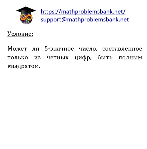 \( \underline{\mathrm{y}_{\text {словие: }}} \) Может ли 5-значное число, составленное только из четных цифр, быть полным квадратом.