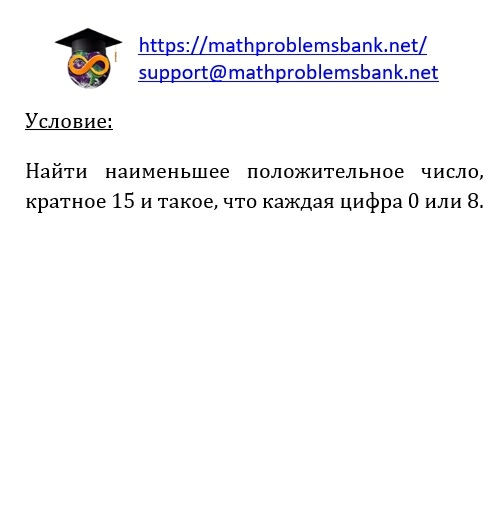 Условие: Найти наименьшее положительное число, кратное 15 и такое, что каждая цифра 0 или 8.
