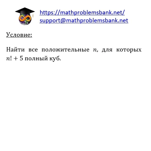 Условие: Найти все положительные \( n \), для которых \( n !+5 \) полный куб.