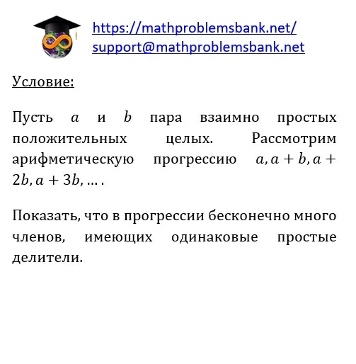 \( \underline{\mathrm{y}_{\text {словие: }}} \) Пусть \( a \) и \( b \) пара взаимно простых положительных целых. Рассмотрим арифметическую прогрессию \( a, a+b, a+ \) \( 2 b, a+3 b, \ldots \) Показать, что в прогрессии бесконечно много членов, имеющих одинаковые простые делители.