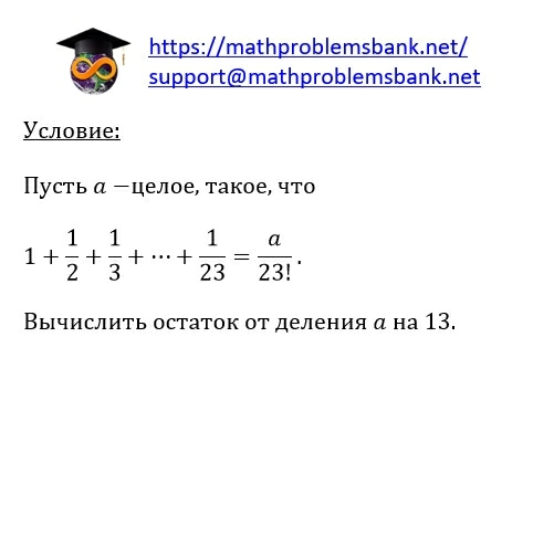 Условие: \[ 1+\frac{1}{2}+\frac{1}{3}+\cdots+\frac{1}{23}=\frac{a}{23 !} \] Вычислить остаток от деления \( a \) на 13 .