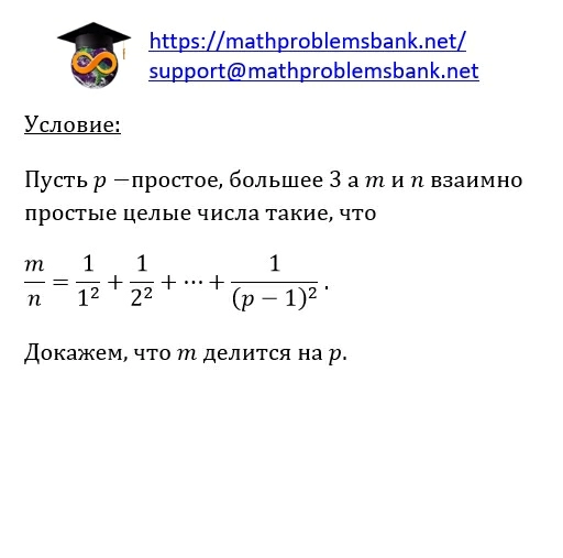 условие: Пусть \( p- \) простое, большее 3 а \( m \) и \( n \) взаимно простые целые числа такие, что \[ \frac{m}{n}=\frac{1}{1^{2}}+\frac{1}{2^{2}}+\cdots+\frac{1}{(p-1)^{2}} \] Докажем, что \( m \) делится на \( p \).