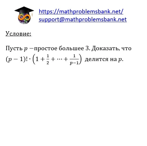 условие: Пусть \( p- \) простое большее 3. Доказать, что \( (p-1) ! \cdot\left(1+\frac{1}{2}+\cdots+\frac{1}{p-1}\right) \) делится на \( p \).