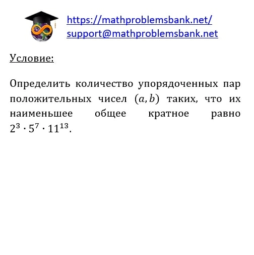 условие: Определить количество упорядоченных пар положительных чисел \( (a, b) \) таких, что их наименьшее общее кратное равно \( 2^{3} \cdot 5^{7} \cdot 11^{13} \)