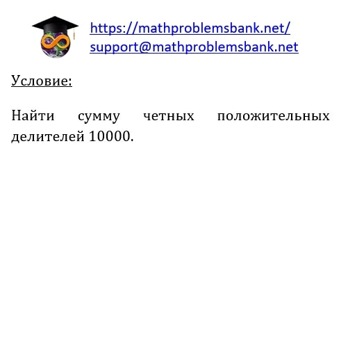 \( \underline{\text { Условие: }} \) Найти сумму четных положительных делителей 10000.