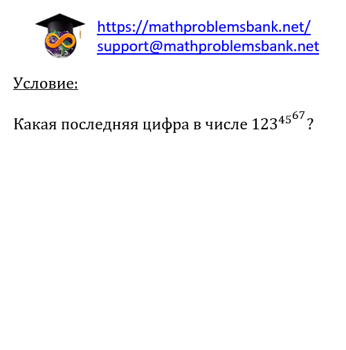 условие: Какая последняя цифра в числе \( 123^{45^{67}} \) ?