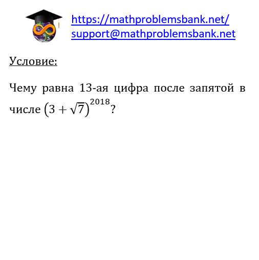 условие: Чему равна 13-ая цифра после запятой в числе \( (3+\sqrt{7})^{2018} \) ?