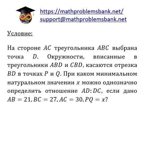 \( \underline{\mathrm{y}_{\text {словие: }}} \) На стороне \( A C \) треугольника \( A B C \) выбрана точка D. Окружности, вписанные в треугольники \( A B D \) и \( C B D \), касаются отрезка \( B D \) в точках \( P \) и \( Q \). При каком минимальном натуральном значении \( x \) можно однозначно определить отношение \( A D: D C \), если дано \( A B=21, B C=27, A C=30, P Q=x \) ?