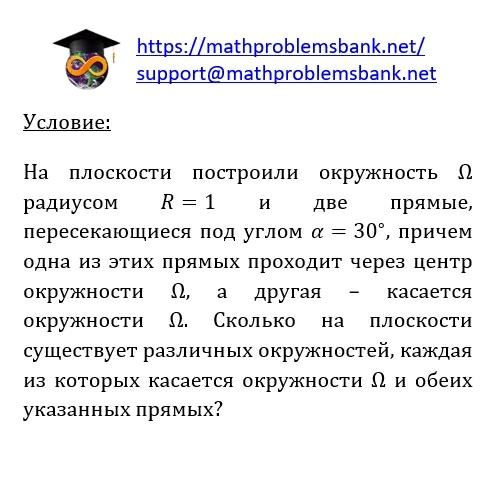 \( \underline{\mathrm{y}_{\text {словие: }}} \) На плоскости построили окружность \( \Omega \) радиусом \( R=1 \) и две прямые, пересекающиеся под углом \( \alpha=30^{\circ} \), причем одна из этих прямых проходит через центр окружности \( \Omega \), а другая - касается окружности \( \Omega \). Сколько на плоскости существует различных окружностей, каждая из которых касается окружности \( \Omega \) и обеих указанных прямых?