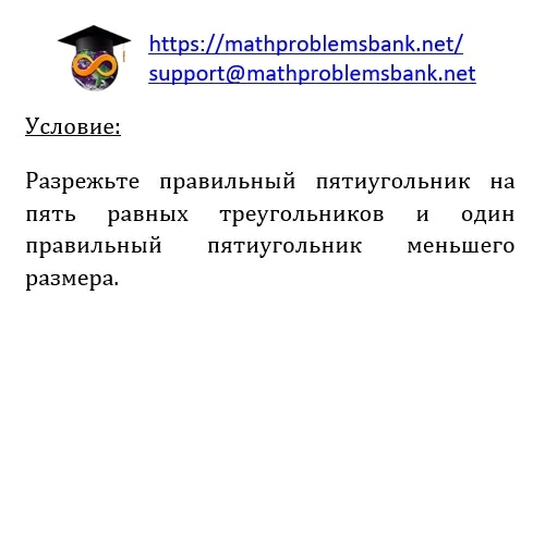 Условие: Разрежьте правильный пятиугольник на пять равных треугольников и один правильный пятиугольник меньшего размера.