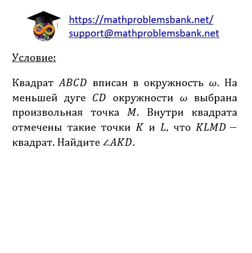 условие: Квадрат \( A B C D \) вписан в окружность \( \omega \). На меньшей дуге \( C D \) окружности \( \omega \) выбрана произвольная точка \( M \). Внутри квадрата отмечены такие точки \( K \) и \( L \), что \( K L M D- \) квадрат. Найдите \( \angle A K D \).