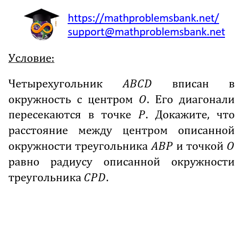 условие: Четырехугольник \( A B C D \) вписан в окружность с центром O. Его диагонали пересекаются в точке \( P \). Докажите, что расстояние между центром описанной окружности треугольника \( A B P \) и точкой \( O \) равно радиусу описанной окружности треугольника \( C P D \).