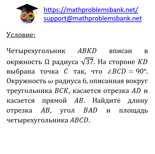 Условие: Четырехугольник \( A B K D \) вписан в окржность \( \Omega \) радиуса \( \sqrt{37} \). На стороне \( K D \) выбрана точка \( C \) так, что \( \angle B C D=90^{\circ} \). Окружность \( \omega \) радиуса 6 , описанная вокруг треугольника \( B C K \), касается отрезка \( A D \) и касается прямой \( A B \). Найдите длину отрезка \( A B \), угол \( B A D \) и площадь четырехугольника \( A B C D \).