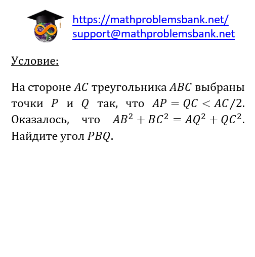 условие: На стороне \( A C \) треугольника \( A B C \) выбраны точки \( P \) и \( Q \) так, что \( A P=Q C