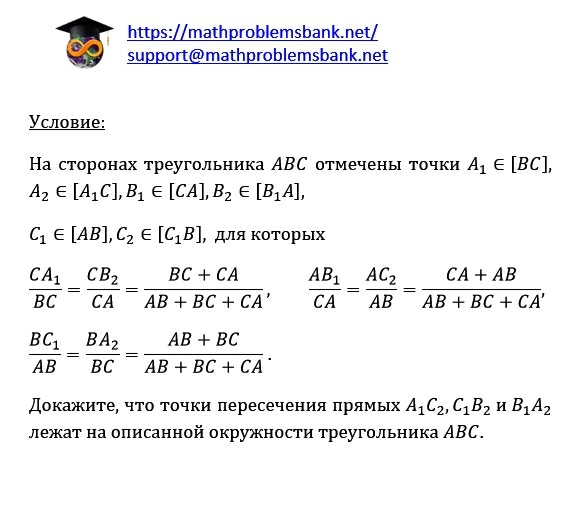\( \underline{\mathrm{y}_{\text {словие: }}} \) На сторонах треугольника \( A B C \) отмечены точки \( A_{1} \in[B C] \), \( A_{2} \in\left[A_{1} C\right], B_{1} \in[C A], B_{2} \in\left[B_{1} A\right] \) \( C_{1} \in[A B], C_{2} \in\left[C_{1} B\right] \), для которых \( \frac{C A_{1}}{B C}=\frac{C B_{2}}{C A}=\frac{B C+C A}{A B+B C+C A}, \quad \frac{A B_{1}}{C A}=\frac{A C_{2}}{A B}=\frac{C A+A B}{A B+B C+C A^{\prime}} \), \( \frac{B C_{1}}{A B}=\frac{B A_{2}}{B C}=\frac{A B+B C}{A B+B C+C A} \). Докажите, что точки пересечения прямых \( A_{1} C_{2}, C_{1} B_{2} \) и \( B_{1} A_{2} \) лежат на описанной окружности треугольника \( A B C \).