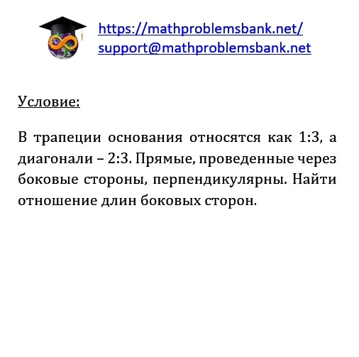 Условие: В трапеции основания относятся как \( 1: 3 \), а диагонали - 2:3. Прямые, проведенные через боковые стороны, перпендикулярны. Найти отношение длин боковых сторон.