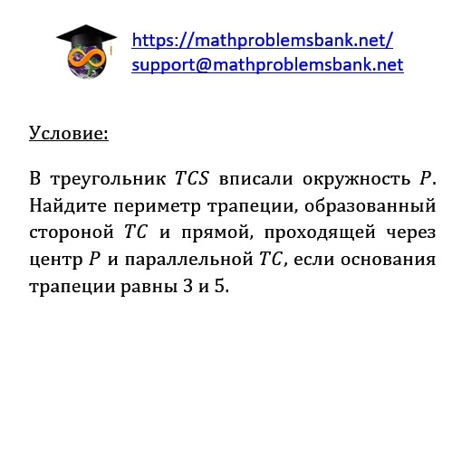Условие: В треугольник \( T C S \) вписали окружность \( P \). Найдите периметр трапеции, образованный стороной \( T C \) и прямой, проходящей через центр \( P \) и параллельной \( T C \), если основания трапеции равны 3 и 5 .