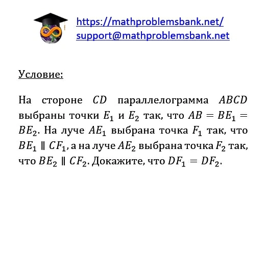 условие: На стороне \( C D \) параллелограмма \( A B C D \) выбраны точки \( E_{1} \) и \( E_{2} \) так, что \( A B=B E_{1}= \) \( B E_{2} \). На луче \( A E_{1} \) выбрана точка \( F_{1} \) так, что \( B E_{1} \| C F_{1} \), а на луче \( A E_{2} \) выбрана точка \( F_{2} \) так, что \( B E_{2} \| C F_{2} \). Докажите, что \( D F_{1}=D F_{2} \).