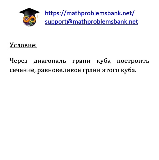 условие: Через диагональ грани куба построить сечение, равновеликое грани этого куба.