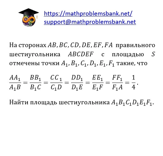 На сторонах \( A B, B C, C D, D E, E F, F A \) правильного шестиугольника \( A B C D E F \) с площадью \( S \) отмечены точки \( A_{1}, B_{1}, C_{1}, D_{1}, E_{1}, F_{1} \) такие, что \[ \frac{A A_{1}}{A_{1} B}=\frac{B B_{1}}{B_{1} C}=\frac{C C_{1}}{C_{1} D}=\frac{D D_{1}}{D_{1} E}=\frac{E E_{1}}{E_{1} F}=\frac{F F_{1}}{F_{1} A}=\frac{1}{4} . \] Найти площадь шестиугольника \( A_{1} B_{1} C_{1} D_{1} E_{1} F_{1} \).