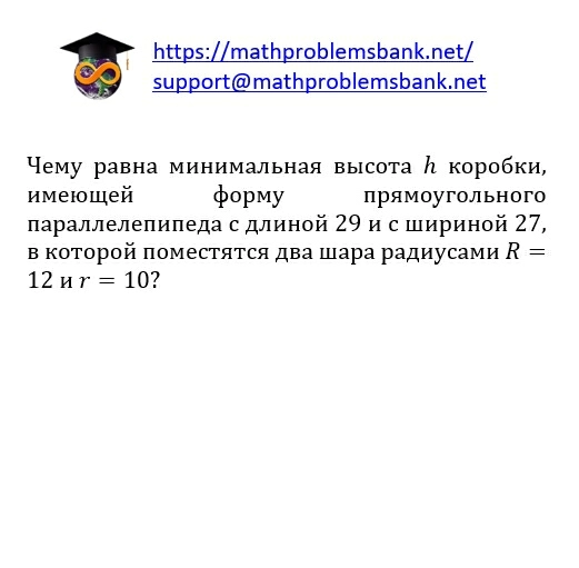 Чему равна минимальная высота \( h \) коробки, имеющей форму прямоугольного параллелепипеда с длиной 29 и с шириной 27 , в которой поместятся два шара радиусами \( R= \) 12 и \( r=10 ? \)