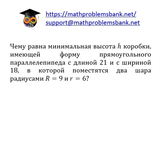 Чему равна минимальная высота \( h \) коробки, имеющей форму прямоугольного параллелепипеда с длиной 21 и с шириной 18, в которой поместятся два шара радиусами \( R=9 \) и \( r=6 \) ?