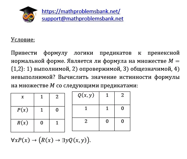 условие: Привести формулу логики предикатов к пренексной нормальной форме. Является ли формула на множестве \( M= \) \( \{1,2\}: 1) \) выполнимой, 2) опровержимой, 3) общезначимой, 4) невыполнимой? Вычислить значение истинности формулы на множестве \( M \) со следующими предикатами: \begin{tabular}{|c|c|c|} \hline\( x \) & 1 & 2 \\ \hline\( P(x) \) & 1 & 0 \\ \hline\( R(x) \) & 0 & 1 \\ \hline \end{tabular} \begin{tabular}{|c|c|c|} \hline\( Q(x, y) \) & 1 & 2 \\ \hline 1 & 1 & 0 \\ \hline 2 & 0 & 0 \\ \hline \end{tabular} \[ \forall x P(x) \rightarrow(R(x) \rightarrow \exists y Q(x, y)) \]