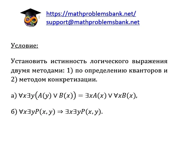 Условие: Установить истинность логического выражения двумя методами: 1) по определению кванторов и 2) методом конкретизации. a) \( \forall x \exists y(A(y) \vee B(x))=\exists x A(x) \vee \forall x B(x) \), б) \( \forall x \exists y P(x, y) \Rightarrow \exists x \exists y P(x, y) \).