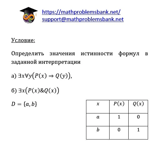\( \underline{\text { условие: }} \) Определить значения истинности формул в заданной интерпретации a) \( \exists x \forall y(P(x) \Rightarrow Q(y)) \), б) \( \exists x(P(x) \& Q(x)) \) \( D=\{a, b\} \) \begin{tabular}{|c|c|c|} \hline\( x \) & \( P(x) \) & \( Q(x) \) \\ \hline\( a \) & 1 & 0 \\ \hline\( b \) & 0 & 1 \\ \hline \end{tabular}