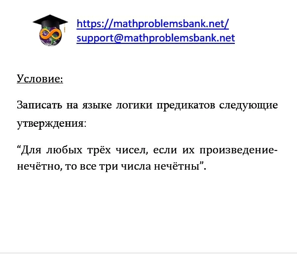 Условие: Записать на языке логики предикатов следующие утверждения: “Для любых трёх чисел, если их произведениенечётно, то все три числа нечётны".