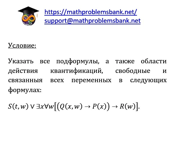 Условие: Указать все подформулы, а также области действия квантификаций, свободные и связанныя всех переменных в следующих формулах: \[ S(t, w) \vee \exists x \forall w[(Q(x, w) \rightarrow P(x)) \rightarrow R(w)] \]