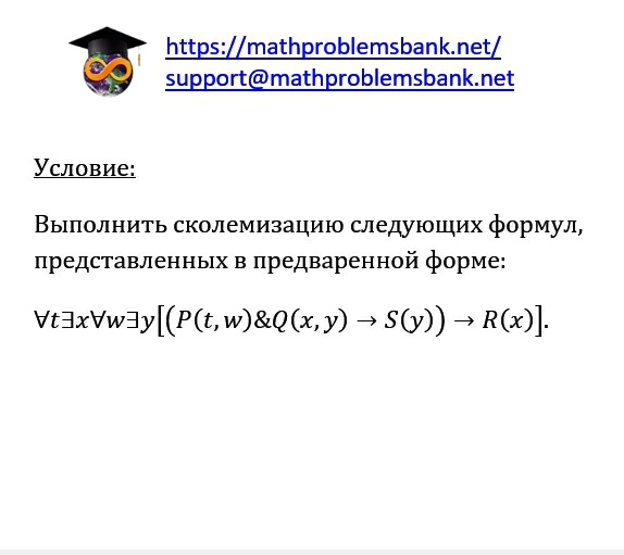Условие: Выполнить сколемизацию следующих формул, представленных в предваренной форме: \[ \forall t \exists x \forall w \exists y[(P(t, w) \& Q(x, y) \rightarrow S(y)) \rightarrow R(x)] \]