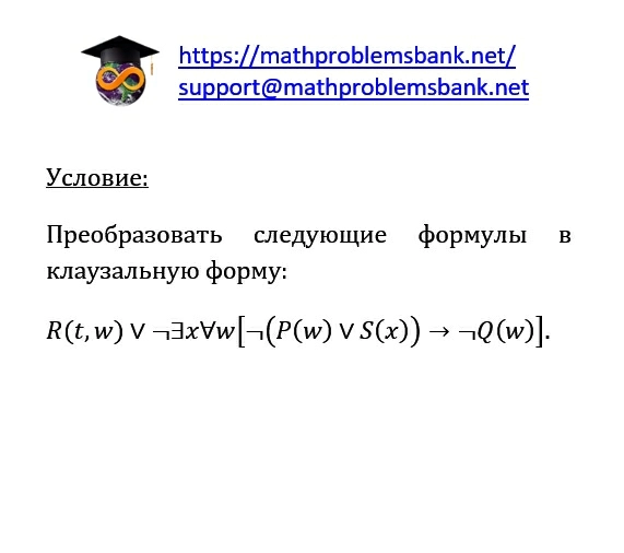 Условие: Преобразовать следующие формулы в клаузальную форму: \[ R(t, w) \vee \neg \exists x \forall w[\neg(P(w) \vee S(x)) \rightarrow \neg Q(w)] . \]
