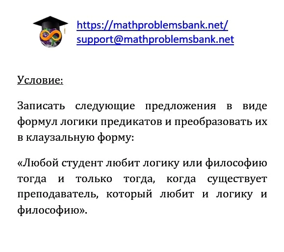 Условие: Записать следующие предложения в виде формул логики предикатов и преобразовать их в клаузальную форму: «Любой студент любит логику или философию тогда и только тогда, когда существует преподаватель, который любит и логику и философию».