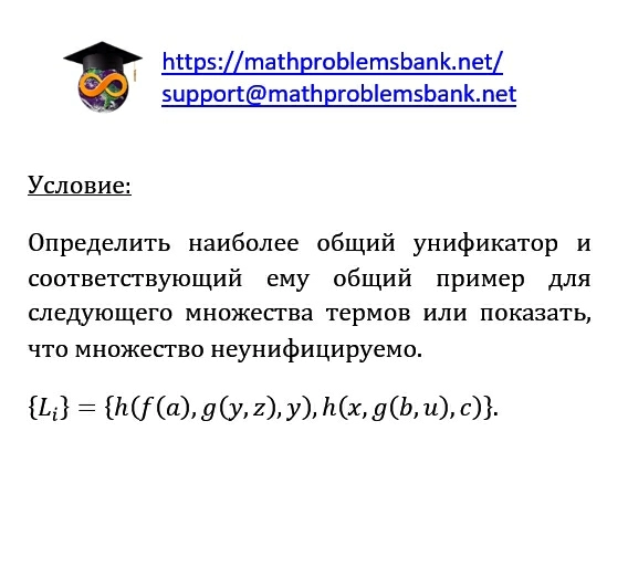 Условие: Определить наиболее общий унификатор и соответствующий ему общий пример для следующего множества термов или показать, что множество неунифицируемо. \[ \left\{L_{i}\right\}=\{h(f(a), g(y, z), y), h(x, g(b, u), c)\} \]