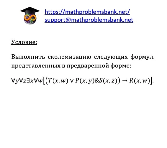 Условие: Выполнить сколемизацию следующих формул, представленных в предваренной форме: \[ \forall y \forall z \exists x \forall w[(T(x, w) \vee P(x, y) \& S(x, z)) \rightarrow R(x, w)] . \]