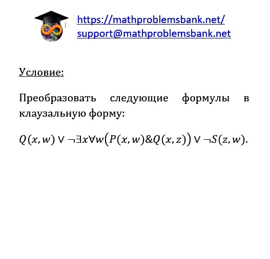 Условие: Преобразовать следующие формулы в клаузальную форму: \[ Q(x, w) \vee \neg \exists x \forall w(P(x, w) \& Q(x, z)) \vee \neg S(z, w) . \]
