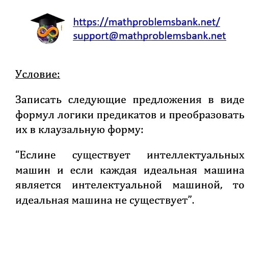 условие: Записать следующие предложения в виде формул логики предикатов и преобразовать их в клаузальную форму: “Еслине существует интеллектуальных машин и если каждая идеальная машина является интелектуальной машиной, то идеальная машина не существует".