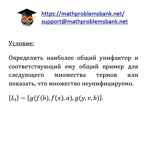 Условие: Определить наиболее общий унифактор и соответствующий ему общий пример для следующего множества термов или показать, что множество неунифицируемо. \[ \left\{L_{i}\right\}=\{g(f(b), f(x), a), g(y, v, b)\} \]