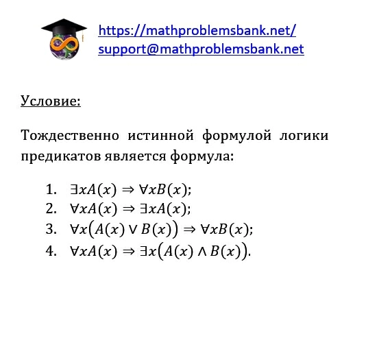 Условие: Тождественно истинной формулой логики предикатов является формула: 1. \( \exists x A(x) \Rightarrow \forall x B(x) \); 2. \( \forall x A(x) \Rightarrow \exists x A(x) \); 3. \( \forall x(A(x) \vee B(x)) \Rightarrow \forall x B(x) \); 4. \( \forall x A(x) \Rightarrow \exists x(A(x) \wedge B(x)) \).