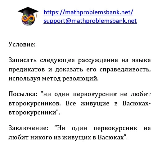 \( \underline{\text { условие: }} \) Записать следующее рассуждение на языке предикатов и доказать его справедливость, используя метод резолюций. Посылка: “ни один первокурсник не любит второкурсников. Все живущие в Васюкахвторокурсники". Заключение: "Ни один первокурсник не любит никого из живущих в Васюках".