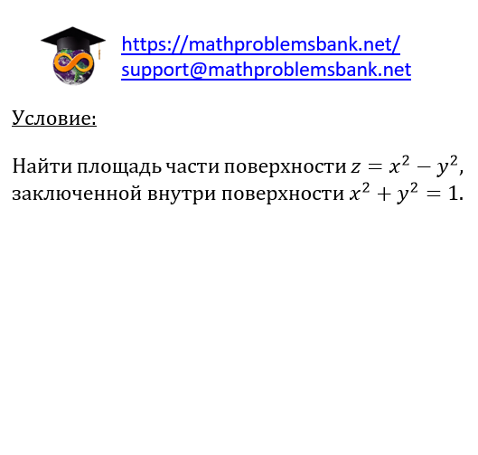 Условие: Найти площадь части поверхности \( z=x^{2}-y^{2} \), заключенной внутри поверхности \( x^{2}+y^{2}=1 \).