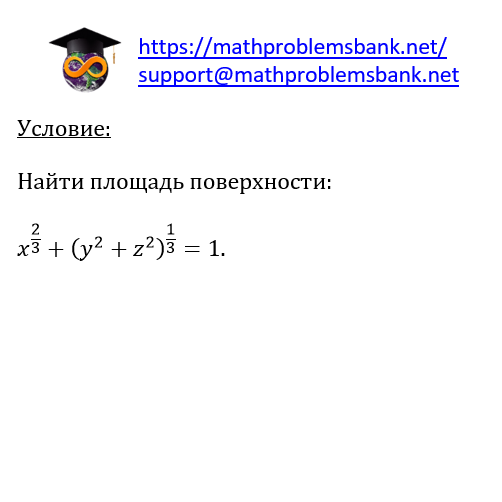 Yсловие: Найти площадь поверхности: \[ x^{\frac{2}{3}}+\left(y^{2}+z^{2}\right)^{\frac{1}{3}}=1 \]